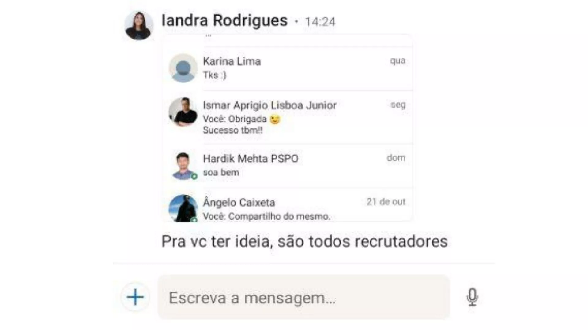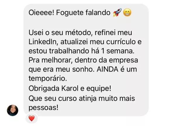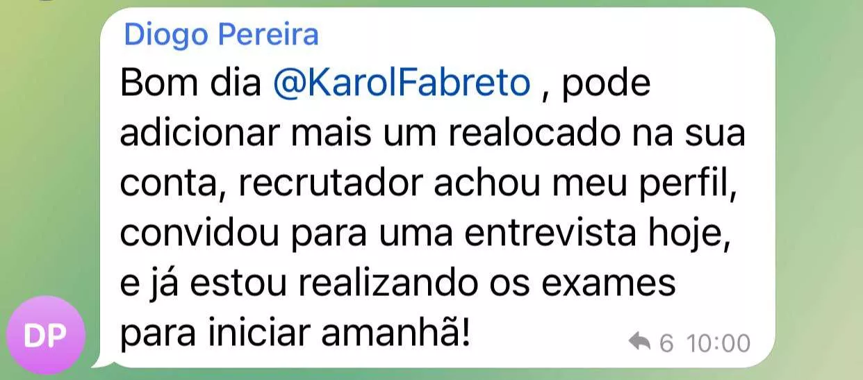 Foi aí que ela teve contato com esse método que vou te apresentar e ela parou de ser IGNORADA pelos recrutadores, para SER NOTADA no LinkedIn, recebendo convites para entrevistas mesmo SEM SE INSCREVER EM VAGAS, chegando a fazer 4 entrevistas em uma semana e antes de um mês já estava no seu EMPREGO DOS SONHOS: