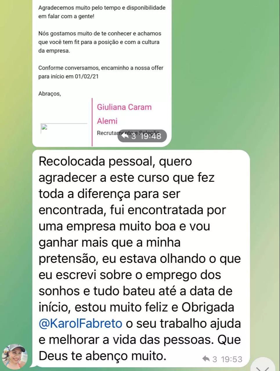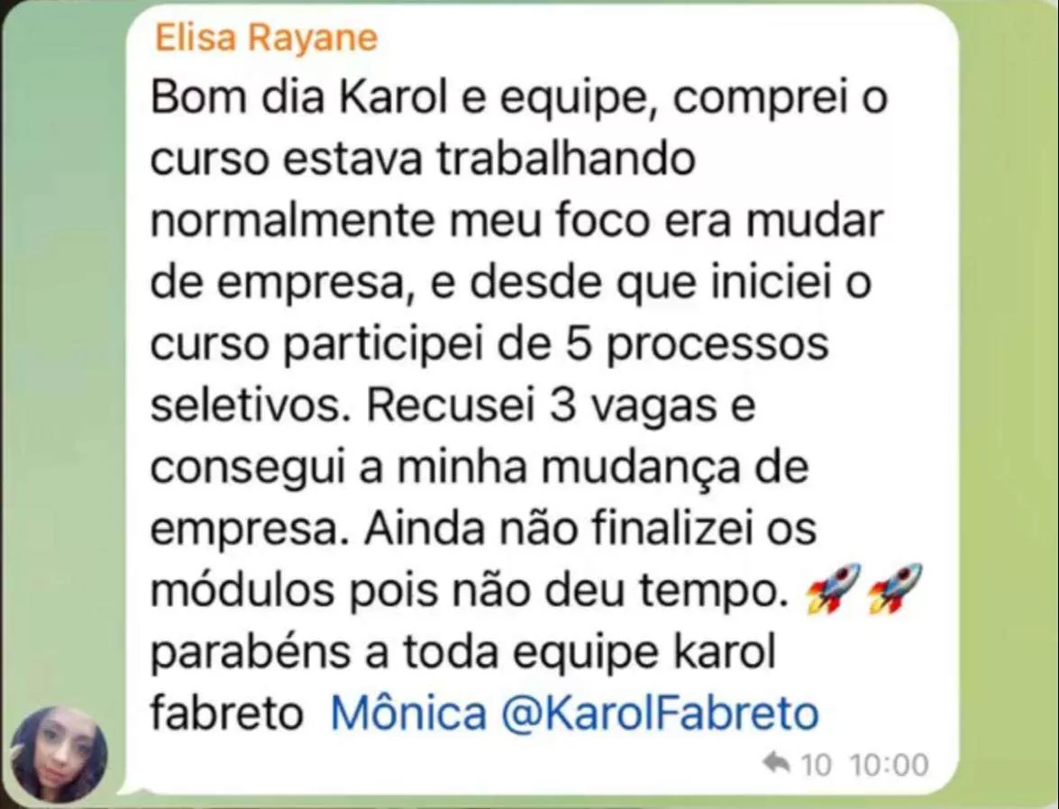 Eu, Karol Fabreto, realmente entendo isso porque tenho mais de 8 anos de carreira como recrutadora me tornei referência no Brasil quando o assunto é recolocação e conto hoje com mais de 100 mil seguidores em todas minhas redes sociais.